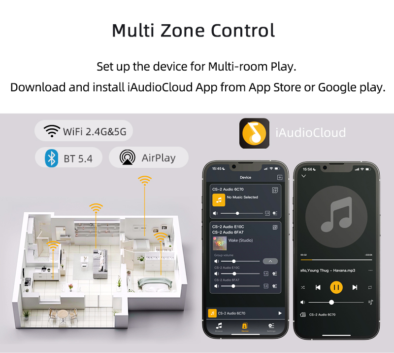 With iOS system (iPhone, iPad, iMac) smart device, choose Airplay 2 function and play any music you want without app