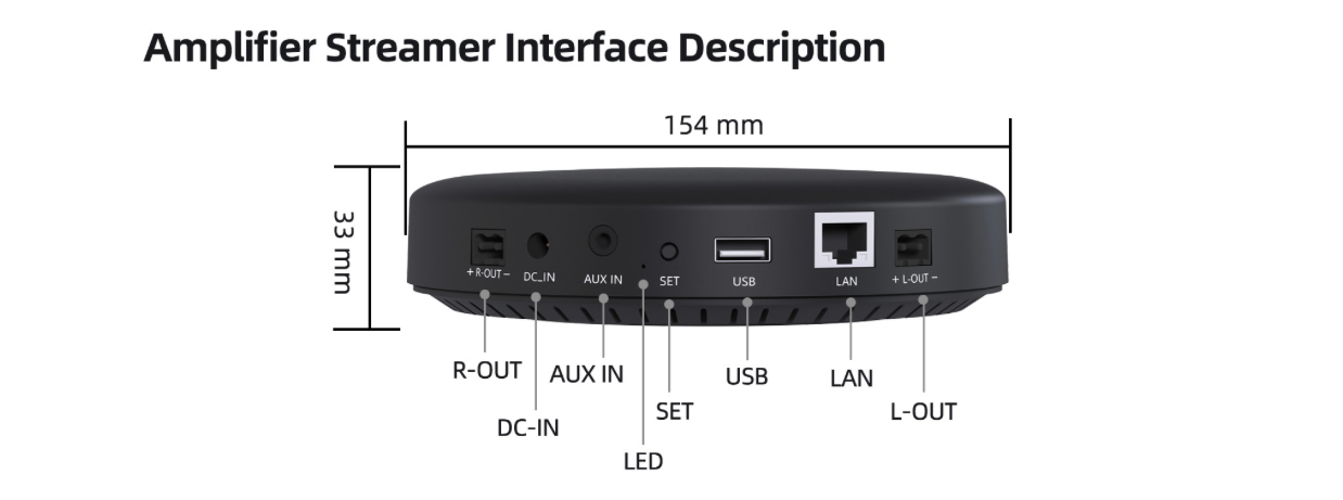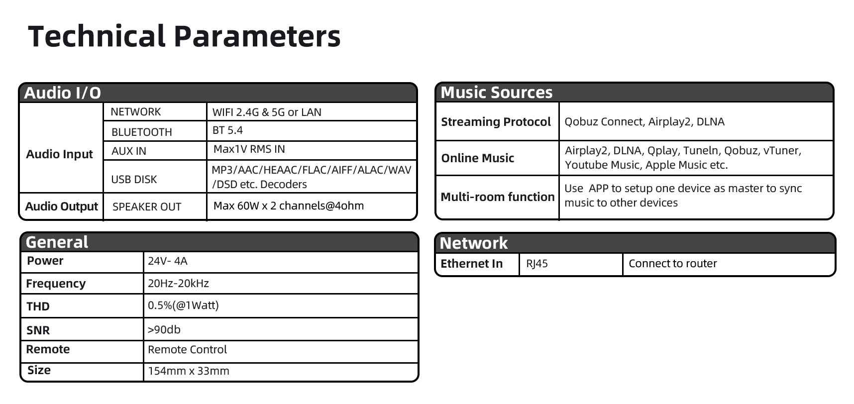 | Network Audio: | Built-in audio network player. Airplay 2, DLNA, UPnP-streamer. Streaming music directly from phone or NAS(Network Attached Storage and home PC). You can connect airScope to your home network or internet to enjoy Internet radio – Spotify, Qobuz, TuneIn, vTuner, Tidal, Apple Music, YouTube Music |