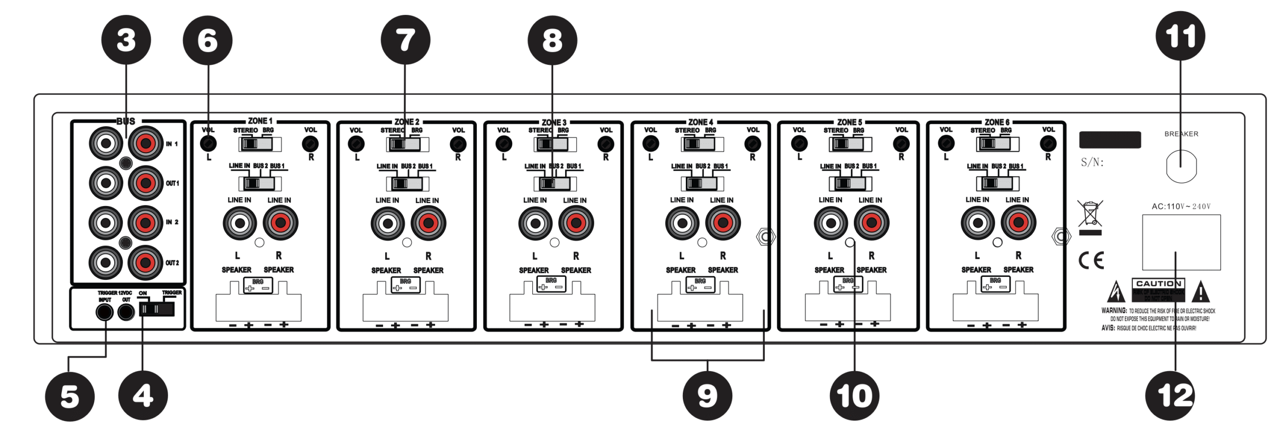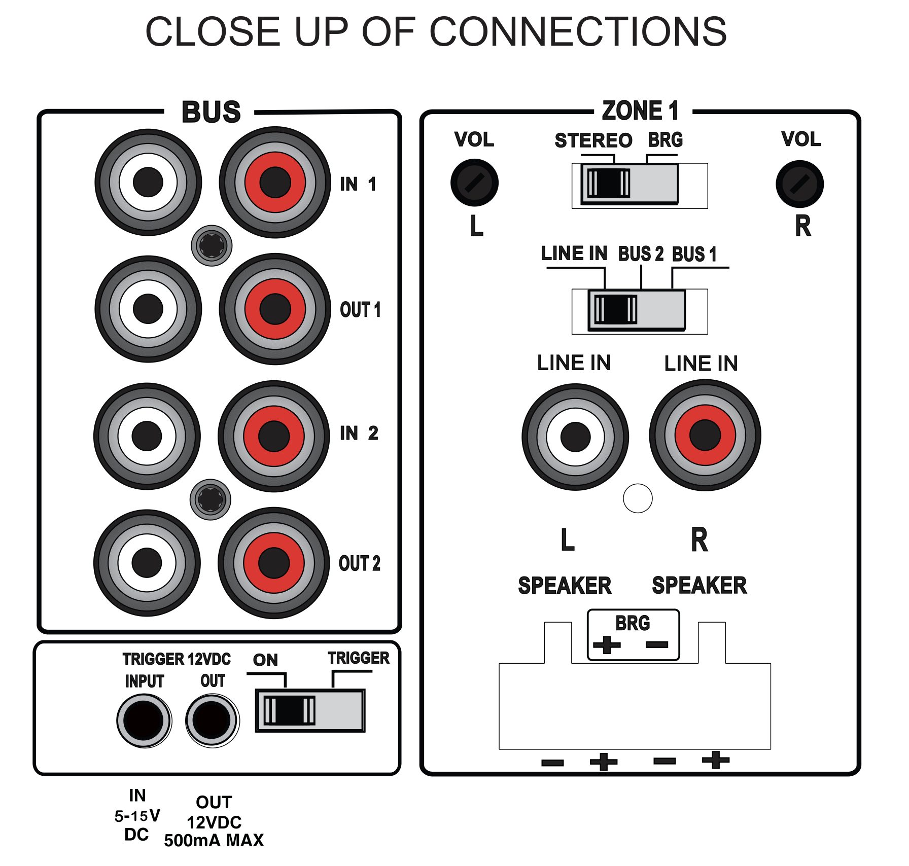 | Audio In: | Bus 1,Bus 2, Line In for each zone |
